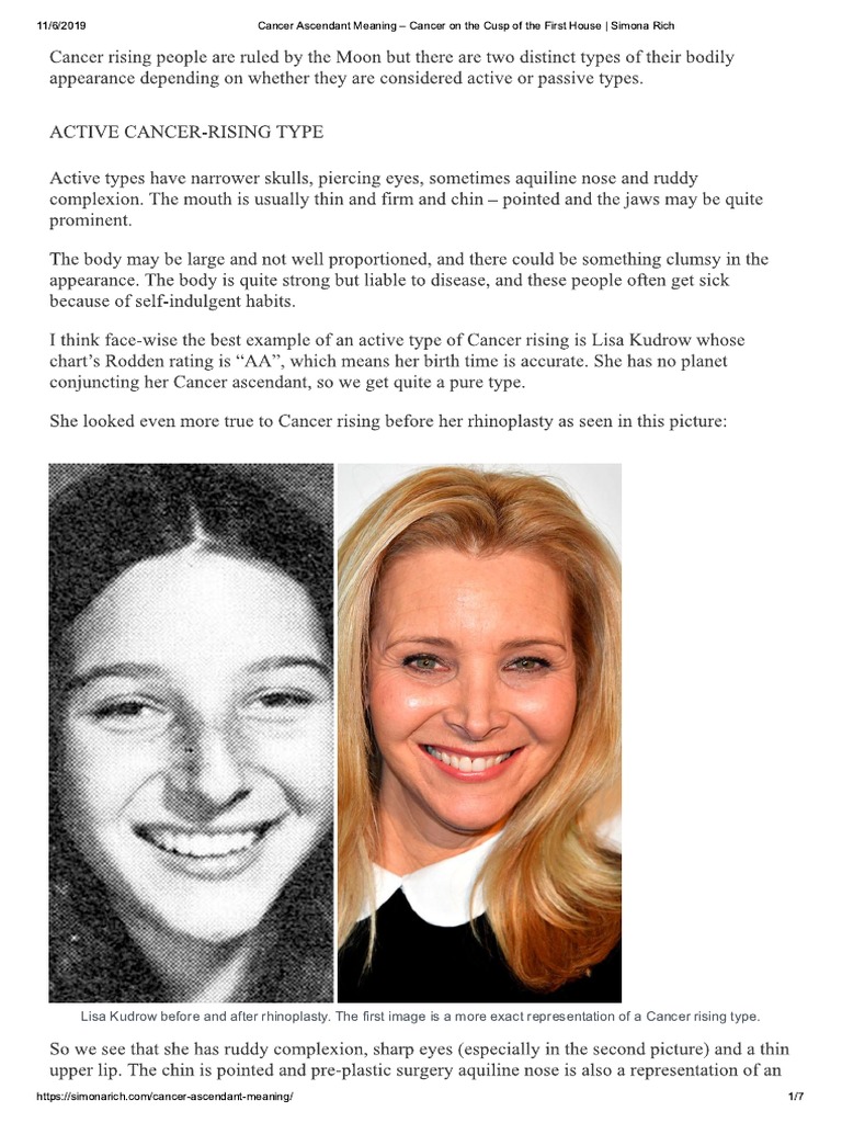 How a cancer rising person looks: This lady can escape many of her fears by having someone who offers her security close by. The fate is bound up with domestic ties, family interests and impressionable attachments, and much will depend upon environment and general surroundings with regard. These people tend to put on weight, especially in the hip area. When she was youn when she was youn cancer sun, aries moon, cancer rising that's me!